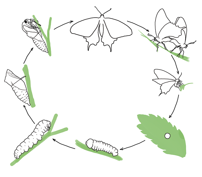 Der Schmetterling ist nun erwachsen. Fortan wird er nicht mehr wachsen und muss deshalb sein Außenskelett nicht mehr erneuern. Etwa eine Stunde benötigen die Flügel zum Aushärten, dann erobert der Falter die Lüfte, fliegt von Blüte zu Blüte, saugt mit seinem Rüssel Nektar und hält Hochzeit. Am Ende des Schmetterlingslebens legen die Weibchen ihre Eier, aus denen bald wieder kleine Räupchen schlüpfen. Je nach Schmetterlingsart, Jahreszeit und vorherrschenden Temperaturen kann die Entwicklung vom Ei bis zum Falter ein paar Wochen oder auch ein ganzes Jahr dauern. Wenn es gilt, den Winter zu überstehen, vergehen oft viele Monate der Winterruhe, bevor die Entwicklung im folgenden Frühling fortschreitet. Die verschiedenen Lebensphasen eines Schmetterlings gehen nicht nur mit einer Gestaltumwandlung, der vollständigen Metamorphose, einher. Meist haben Raupe und Falter ein und derselben Art auch unterschiedliche Nahrungspflanzen und benötigen unterschiedliche Lebensräume. Nur wenn in der Umwelt alle Voraussetzungen erfüllt sind, kann sich aus einem Ei eine Raupe, dann eine Puppe und schließlich ein Falter entwickeln.