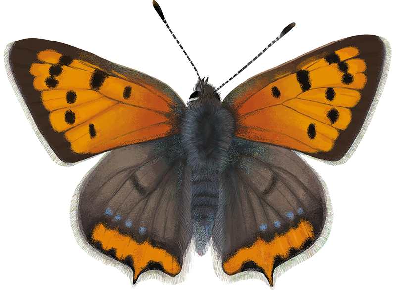 Vorderflügel etwa 13 mm lang, oberseits glänzend orange, mit schwarzen Punkten und breitem braunen Flügelrand; Hinterflügel dunkelbraun, vor dem Hinterrand mit einer mehr oder weniger deutlichen blauen Punktreihe, die auch fehlen kann, und einer stets deutlichen orangen Binde, in die schwarze Punkte hineinragen und von der das Orange in einen kleinen Zipfel des Flügelhinterrandes hineinläuft. Alle Flügel oberseits mit weißen Fransen. Unterseits die Vorderflügel matt orange, mit schwarzen Punkten und hellbraunem Rand; Hinterflügel hell graubraun mit nur kleinen undeutlichen schwarzen Punkten und einer orangen, oft verwaschenen Strichellinie vor dem Flügelrand.