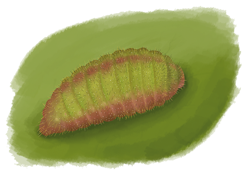 Die Raupen sind asselförmig, grün, und können eine mehr oder weniger ausgeprägte weinrote Rückenlinie und Bauchfärbung aufweisen. Sie fressen an den Blättern und Früchten des Kleinen Sauerampfers (