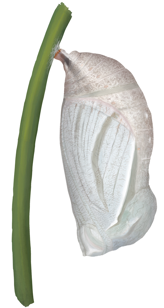 Im Frühling erfolgt die Umwandlung zu einer grünen oder weißlich-grauen Stürzpuppe, die auf den Flügeln drei dunkle, geschwungene Streifen besitzt. Sie ähnelt der Puppe des Großen Ochsenauges, doch fehlen ihr die spitzen Fortsätze über den Augen.