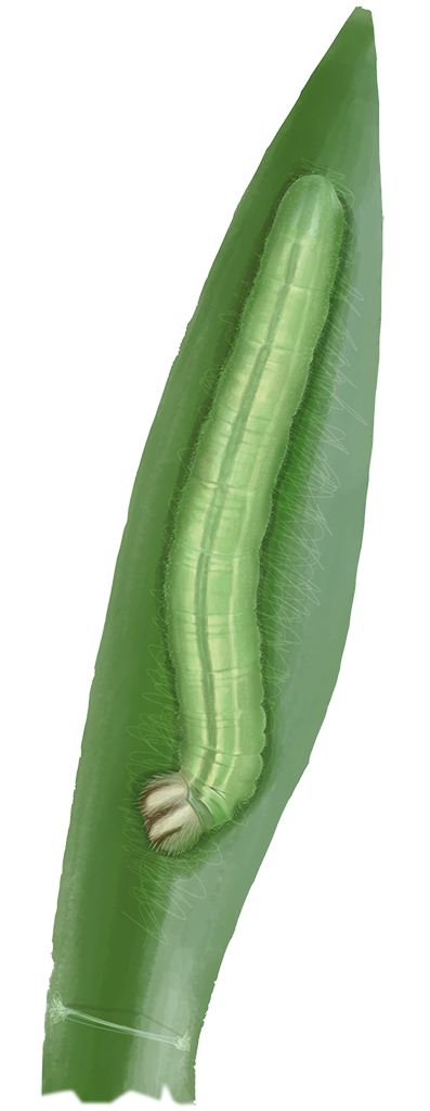 Die hellgrünen Raupen haben einen dunkelgrünen Rückenstreifen und seitlich davon undeutliche helle Längslinien. Mit dieser Färbung sind sie an Gräsern vorzüglich getarnt. Im Frühjahr leben die jungen Raupen in einer Blattröhre, später mehr oder weniger frei, an mit wenigen Gespinstfäden überzogenen Blättern.